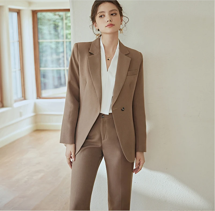 Tailored Silhouette: Classic single-breasted blazer paired with high-waisted straight-leg trousers, featuring clean-cut tailoring to flatter the figure and amplify professional presence in the workplace.